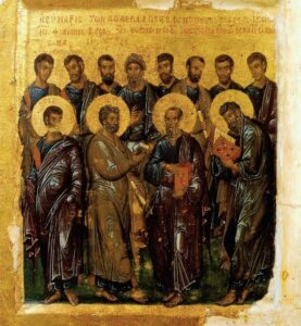 Les apôtres décident de décentraliser le pouvoir. La diaconie de la Parole leur est réservée, tandis que la diaconie des tables sera affectée à sept hommes remplis de l’Esprit Saint et de sagesse.